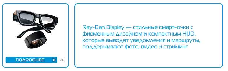 - Ray-Ban Display — стильный формат интеллектуальных очковRay-Ban Display сохраняют классический дизайн бренда и получают информативный мини-HUD. Модель выводит уведомления и маршруты, поддерживает фото, видео и стриминг. Направленный звук обеспечивает приватность, делая очки удобными для повседневных задач.