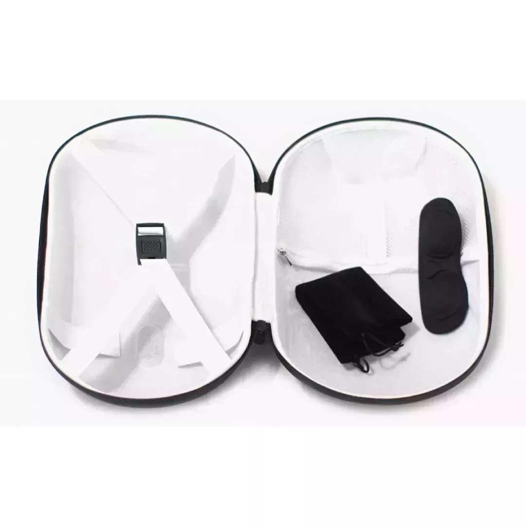 В нем комфортно разместятся Oculus Quest 2, Quest 3, PICO 4 и другие шлемы. Просторное основное отделение рассчитано на гарнитуру с любым фирменным или сторонним ремнем, будь то Elite Strap, BoboVR S3 Pro или аналог. Дополнительно есть место для всего необходимого: пары контроллеров, Power Bank, зарядного блока и кабеля, включая длинный Link-кабель для ПК.